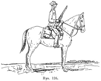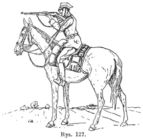Strzelać zawsze celownikiem najniższym! Strzelanie nr 19 jest strzelaniem ostrym w postawie leżąc z oparciem na odległość 200 m. Ilość naboi: 3 próbne plus oceniane do tarczy H nr 4, tło zielone. Ocena na punkty: 28 pktów - bardzo dobrze, 22 pkty - dobrze, 16 pktów lub 2 trafienia w figurę - dostatecznie. Strzelanie to jest sprawdzianem jednolitości celowania na odległość 200 m w strzałach próbnych. Dobór punktu celowania w strzałach ocenianych. C. WSKAZÓWKI METODYCZNE.Strzał podchwytowy ćwiczyć najpierw do sylwetek stojących, a następnie ukazujących się na gwizdek. LEKCJA DWUDZIESTA TRZECIA.A. CEL.Strzelanie nr 20. Ładowanie i rozładowanie w postawie strzeleckiej na koniu. Składanie się do strzału podchwytowego, celowanie i danie strzału nabojem szkolnym do figurki biegnącego i figurki konnego w postawie strzeleckiej przy koniu. B. TREŚĆ.Jeździec na koniu, chcąc przyjąć postawę strzelecką, z postawy "do boju broń" (patrz lekcję 11-tą Musztry), trzymając karabinek prawą ręką za szyjkę, ustawia trzewik kolby na prawym udzie na dwie dłonie od stawu biodrowego. Lufa skierowana w lewo w przód i do góry. Przedramię opuszczone swobodnie wzdłuż ciała, ramię zgięte w łokciu (rys. 126), po czym, w razie potrzeby, ładuje. ![]() Ładowanie i rozładowanie karabinka wykonywa tak samo jak pieszo. Karabinek chwytać lewą ręką nie wypuszczając wodzy. Po naładowaniu przyjąć postawę "do boju". Przed zawieszeniem na plecy karabinek rozładować. Strzelanie nr 20 jest strzelaniem nabojem ślepym w postawie strzeleckiej z koniem w ręku na odległość 25 m. Dość naboi - 3 naboje ślepe do tarczy H nr 6. C. WSKAZÓWKI METODYCZNE.Przy strzelaniu (tylko nabojem ślepym), gdy koń jest niespokojny, należy go przyzwyczaić do strzału, przez dawanie mu trochę owsa lub siana podczas strzału. LEKCJA DWUDZIESTA CZWARTA.A. CEL.Strzelanie nr 21. Składanie się do strzału podchwytowego, celowanie i dawanie strzału nabojem szkolnym do tarczy H nr 6 w postawie strzeleckiej na koniu. B. TREŚĆ.Składanie się, celowanie i oddanie strzału na koniu wykonywa się: