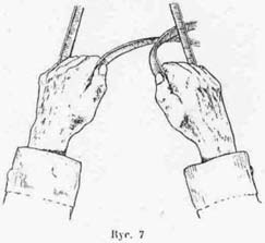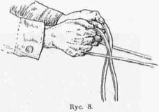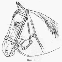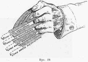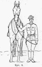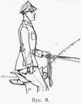 Pomoce.19. Pomoce.Pomocami nazywamy środki, których jeździec używa w celu przekazania swej woli koniowi. Są to łydki i wodze. 20. Łydki i ostrogi.Łydki służą do pchnięcia konia naprzód i przesunięcia jego zadu w bok. Działają naciskiem, zaczynając od górnej części łydki do dołu, jeżeli zaś to nie wystarcza, pchnięciem. Ostrogi służą do wzmacniania działania łydek. Łydki powinny być w nieustannej styczności z bokami konia. Przy zmianach kierunku (tzn. przy wszystkich zakrętach) łydki równomiernym działaniem zapobiegają w razie potrzeby skracaniu szybkości. 21. Wodze.Wodze służą do nadawania kierunku, zmniejszania szybkości, zatrzymywania i cofania. Ręce jeźdźca powinny być nieustannie w styczności z pyskiem konia; to znaczy, że koń musi mieć lekką łączność przez wodze z ręką jeźdźca. Ręce podążają za ruchami głowy konia. Długość wodzy jest ograniczona ustawieniem rąk (§ 15) i stałą łącznością z pyskiem konia. Położenie ręki powinno być takie, żeby wodze wraz z przedramieniem, widziane z boku, stanowiły linię prostą. A więc ustawienie ręki nie może być stałe, jednak jedna ręka nie powinna być wyżej niż druga. Linia prosta od wędzidła do łokcia powinna być zachowana we wszystkich wypadkach prowadzenia konia. Jeździec działa wodzami przez stopniowo wzmocnione ściąganie ich ku tyłowi. Dla zmiany kierunku jeździec ściąga wodzę wewnętrzną, aby ustawić głowę konia w stronę zakrętu o tyle, żeby nie zmieniając normalnej postawy w siodle mógł widzieć połowę wewnętrznego oka konia. Przy tym wodzą zewnętrzną utrzymuje łączność z pyskiem konia, ograniczając ustawienie głowy do wewnątrz. Jednocześnie uważa, żeby szyja konia pozostała prosta, a głowa, w nasadzie nie została skrzywiona. Dla zmniejszenia szybkości, zatrzymania i cofnięcia jeździec równomiernie ściąga obydwie wodze. Po osiągnięciu skutku jeździec przywraca normalną łączność z pyskiem konia. 22. Trzymanie wodzy, gdy koń jest okiełznany wędzidłem.Na komendę "Wodze - w obie" bierze się je nakładając dłonie z góry tak, aby wodze wewnętrzną stroną były zwrócone do szyi konia, przy czym w każdej ręce przechodzą one między palcem serdecznym a małym, wychodzą zaś między palcem wskazującym a kciukiem; poduszka kciuka przyciska wodze do drugiego stawu palca wskazującego. Koniec wodzy, opuszczony między rękami, zwisa z prawej strony szyi konia. Ręce ustawione jak w § 15 (ryc. 7 i 8). Na komendę "Wodze - w lewą rękę" przenieść lewą rękę przed środek ciała nie zmieniając wysokości jej ustawienia; przełożyć prawą wodzę między palec wskazujący a kciuk, koniec zaś lewej wodzy również między palec wskazujący a kciuk w taki sposób, aby się obie wodze krzyżowały na dłoni, a końce lewej i prawej wodzy były rozdzielone kciukiem. Pięść prawej ręki oprzeć na środku prawego uda tak, aby pierwszymi stawami 4 palców i poduszką kciuka dotykać uda (ryc. 9). Na komendę "Wodze - w prawą rękę" postępuje się odwrotnie. Na komendę "Baczność" ujmuje się wodze jak na komendę "Wodze - w lewą rękę". 23. Trzymanie wodzy, gdy koń jest okiełznany munsztukiem.Na komendę "Baczność" lub gdy nie jest podany inny sposób trzymania wodzy, bierze się najpierw prawą ręką wodze wędzidłowe i wkłada je do lewej ręki tak, aby lewa wodza przechodziła pod palcem małym, a prawa między wskazującym a środkowym. Obie wodze ująć w dłoń tak, aby poduszką kciuka przyciskać je do drugiego stawu palca wskazującego. Następnie, również prawą ręką, ujmuje się wodze munsztukowe i wkłada je do lewej dłoni tak, aby lewa wodza przechodziła między palcem małym a serdecznym, prawa zaś między serdecznym a środkowym. Obie wodze ująć w dłoń między wodze wędzidłowe tak, aby poduszką kciuka przyciskać wszystkie wodze do drugiego stawu palca wskazującego. Końce wodzy zwisają w przód i w prawo. Wszystkie 4 wodze zwrócone wewnętrzną stroną do szyi konia (ryc. 9). Dłoń zamknięta, ustawiona skośnie przed środkiem ciała (ryc. 10). Położenie prawej ręki jak w § 22 (ryc. 9). Na komendę "Wodze - w obie" lewa ręka wypuszcza prawą wodzę wędzidłową i munsztukową, prawa ręka ujmuje je tak, żeby wodza wędzidłowa przechodziła pod małym palcem, munsztukowa między małym palcem a serdecznym oraz aby obie wodze były przyciśnięte poduszką kciuka do drugiego stawu palca wskazującego (ryc. 11) Końce wodzy, opuszczone między rękami, zwisają z prawej strony szyi konia. Dłonie ustawione jak w §§ 15 i 21. Na komendę "Wodze - w lewą rękę" jeździec ujmuje wodze jak na komendę "Baczność" (ryc. 9). 24. Wyrównywanie wodzy.Wodze skraca się ręką wolną za ręką trzymającą wodze, a podłuża przed ręką trzymającą wodze. Jeżeli wodze są ujęte w obie ręce, wówczas lewe wodze wyrównywa się prawą ręką, a prawe - lewą. Nauka na ujeżdżalni.25. Ujeżdżalnia.W razie braku ujeżdżalni ogrodzonej jazda odbywa się na prostokącie, oznaczonym w rogach wysokimi i widocznymi chorągiewkami lub wiechami ze słomy. 26. Jazda w prawo (w lewo).Jazda nazywa się w prawo, jeśli prawa strona jeźdźca jest zwrócona do wnętrza ujeżdżalni, a w lewo - jeśli odwrotnie. 27. Wewnętrzna (zewnętrzna) strona.W stosunku do kierunku jazdy (zakrętu) mówi się: wewnętrzna (zewnętrzna) wodza, łydka, ostroga, noga itd. Na przykład przy jeździe w prawo wewnętrzne będą: prawa wodza, prawa łydka, prawa ostroga itd., a zewnętrzne - lewa wodza, lewa łydka itd. Przy jeździe w lewo - odwrotnie. 28. "Spocznij".Aby dać odpocząć, podaje się komendę "Spocznij", na którą jeźdźcy popuszczają wodze tak, żeby jednakowo długie swobodnie zwisały po obu stronach szyi konia, nie przybierając przy tym postawy nieprawidłowej, i lekko klepią konie po szyi nie pozwalając im zmniejszać chodu. 29. Na zapowiedź