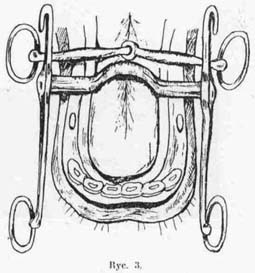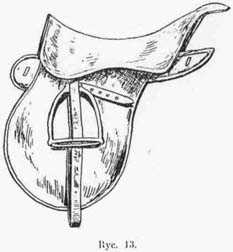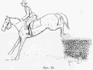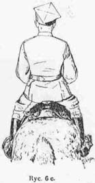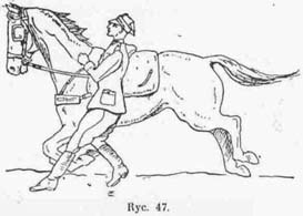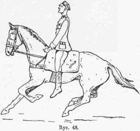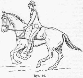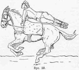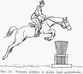 119. Woltyżerka na siodle woltyżerskim.Woltyżerka na siodle woltyżerskim jest środkiem wyrobienia techniki skoku potrzebnej do wskakiwania na siodło wojskowe. Wykonywa się ją na kole, bez broni, pasa i ostróg. 120. Wskok na konia.Aby wskoczyć na konia, należy do niego podbiec, chwycić prawą ręką za prawą rączkę siodła z góry i kciukiem do dołu, a lewą za lewą rączkę siodła z dołu i kciukiem do góry. Podczas biegu obok konia należy lewe ramię cofnąć, co daje możność posuwania się prosto w kierunku ruchu. Biec należy na palcach, mając nogi lekko naprężone, wysunięte przed własny tułów na wysokość przednich nóg końskich (ryc. 47). Przebiegłszy tak kilka kroków należy się silnie odbić obiema złączonymi nogami od ziemi, w takt z wewnętrzną przednią nogą konia i o 1/2 kroku od niego do wewnątrz i do przodu jednocześnie, mocno się opierając i przyciągając rękami wykorzystać podrzut, szybko podrzucić swój tułów prostując w tej chwili ręce; następnie przenieść przez zad konia wyprostowaną prawą nogę i miękko się opuścić w siodło, jak najbliżej jego przodu. Dosiad w siodle powinien być widłowy, z jak najbardziej rozwartymi stawami biodrowymi, nogi naprężone, palce skierowane w dół na zewnątrz (ryc. 48). 121. Zeskok z konia.Aby zeskoczyć z konia do wewnątrz koła, należy chwycić rękami z góry za przednie rączki siodła i wyrzucić prawą nogę od biodra silnym ruchem wstecz, przerzucić ją przez zad koński, jednocześnie pochylając tułów do przodu na jak najbardziej wyprostowanych rękach. Prawą nogę po przerzuceniu przez zad dołączyć natychmiast do lewej, która pozostaje na miejscu. Opierając się prawym biodrem o bok siodła, z tułowiem nieco pochylonym w prawo, kierując obie złączone wyprostowane nogi jak najwięcej ku przodowi (ryc. 49), zeskoczyć z konia stawiając nogi na ziemi wraz z lewą przednią nogą konia, a jednocześnie puścić rączki siodła. Aby zeskoczyć z konia na zewnątrz koła, jeździec postępuje jak wyżej, lecz z tą różnicą, że przerzuca przez zad lewą nogę, dołącza ją do prawej, pozostającej w miejscu itd., tzn. stosując wszystko z przeciwnej strony. 122. Zeskok i wskok.Przy tym ćwiczeniu wykonywa się zeskok jak w § 121 z tą różnicą, że natychmiast, za pierwszym dotknięciem palcami nóg ziemi, należy się odbić i wykonać wskok jak w § 120. Ruchy wyszczególnione w §§ 120 i 121 powinny się zlać w jedną całość, co czyni wykonanie ciągłym i sprężystym. 123. Nożyce.Siedząc na koniu należy chwycić rękami za przednie rączki siodła i pochylając tułów nieco do przodu na jak najbardziej wyprostowanych rękach, szybko, w takt galopu, silnie od bioder wyrzucić wyprostowane nogi wstecz i do góry. Krzyżując nogi w górze trzeba jednocześnie pomóc sobie energicznym ruchem bioder w odpowiednią stronę i natychmiast wypuścić rączki siodła, aby móc usiąść twarzą do zadu końskiego. Trzeba uważać, aby skrzyżowanie nóg odbywało się stosunkowo wysoko nad siodłem, ponieważ w przeciwnym razie nogi zawadzając o siodło nie pozwolą wykonać tego ćwiczenia. Dosiad pozostaje widłowy. Aby siąść twarzą do przodu, trzeba chwycić za tylne pętle w ten sposób, żeby 4 palce były wewnątrz, a kciuk na zewnątrz tych pętel, po czym nachylając się naprzód w chwili podniesienia przez konia przodu wykonać wszystko jak wyżej. Dla ułatwienia nauki robi się z początku nożyce w miejscu, potem w stępie i w galopie. W kłusie tego ćwiczenia się nie wykonywa. 124. Skok przez konia.Wykonywa się tak jak przy wskakiwaniu na konia z tą różnicą, że po odbiciu się nogami od ziemi należy wykonać energiczny zwrot w biodrach w prawo mając nogi złączone; jednocześnie przyciągając się mocno do siodła rękami wznieść nogi wysoko w górę na jak najbardziej wyprostowanych rękach z całym tułowiem nad zadem końskim (ryc. 50), po czym przerzucić się na prawą stronę konia i zeskoczyć obok jego zewnętrznej łopatki, twarzą w kierunku ruchu. Dla ułatwienia wykonania tego ćwiczenia można z początku żądać, aby uczeń wskakiwał na konia zatrzymując się na lewym biodrze z prawej strony siodła. Skok przez konia należy stosować jako zakończenie ćwiczenia. 125. Wskok odwrotny.Odskok wykonywa się tak jak przy zwykłym wskakiwaniu, lecz z tą różnicą, że w chwili odbicia silnym ruchem bioder ciało się obraca w lewo w tył; jeździec siada twarzą do ogona przenosząc jednocześnie lewą nogę przez zad konia i puszczając rączki siodła; następnie chwyta za tylne pętle, wykonywa nożyce jak w § 123 i siada normalnie. 126. Wskok młyńccm.Do wykonania tego wskoku chwyta się obiema rękami za obie tylne pętle, prawą za prawą, a lewą za lewą, w ten sposób, aby 4 palce obu rąk były nałożone z góry, a kciuki od dołu. Ćwiczący się biegnie na wysokości tylnej krawędzi siodła, wykonywa normalny odskok i przenosi tułów ze złączonymi i wyprostowanymi nogami przez zad konia w ten sposób, aby nogi zarzucić ku przodowi, a głowę zwrócić w kierunku zadu konia; po osiągnięciu tej postawy tułowia jednocześnie przenosi prawą nogę przez szyję konia i siada zwrócony twarzą do ogona. W chwili przerzucania tułowia ręce ćwiczącego się trzymające pętle skrzyżowują się; po przerzuceniu nogi przez szyję konia, w chwili znalezienia się w siodle, ćwiczący się puszcza pętle, a następnie chwyta je normalnie i wykonywa nożyce jak w § 123. 127. Stawanie na siodle.Aby stanąć na siodle, należy obiema rękami chwycić za przednie rączki siodła z góry pochylając tułów ku przodowi; jednocześnie wyrzucić nogi do tyłu, po czym zgiąć je w kolanach i opuścić się na palce nóg na środku siodła przysiadem, a następnie stanąć na siodle wypuszczając z rąk rączki siodła. Podczas stania nogi powinny być nie naprężone, całe ciało skierow