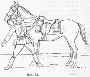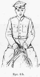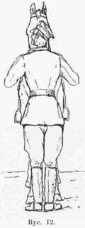 Jeździec postępuje, jak jest powiedziane w § 132 z tą różnicą, że ujmuje lewą (prawą) ręką wraz z wodzami i garść grzywy (ryc. 54). Przy tym ćwiczeniu nie stosować zbyt często cwałów, gdyż niszczy to materiał koński. 135. Zakres woltyżerki na siodle stroczonym na linii prostej.Ćwiczenia w woltyżerce na siodle stroczonym, w pełnym oporządzeniu jeźdźca, należy przerabiać z tymi szeregowcami, którzy już dobrze opanowali woltyż na siodle nie stroczonym i stroczonym, bez oporządzenia i broni. Przy ćwiczeniu w woltyżerce na linii prostej należy mieć na uwadze istotne potrzeby bojowe i nie wymagać od szeregowców sztuk cyrkowych. ROZDZIAŁ B. MUSZTRA PIESZO BEZ BRONI.136. Postawa swobodna.Postawa swobodna jest formą chwilowego wypoczynku szeregowca w toku wykonywania przezeń czynności służbowych. W postawie tej ciężar ciała spoczywa na nodze prawej, która przez cały czas pozostaje w miejscu; lewa noga wysunięta swobodnie w przód, mniej więcej o połowę długości stopy, w kierunku, który wskazuje palce tej nogi. Poza tym szeregowiec ma zupełną swobodę ruchów, ale nie wolno mu rozmawiać. Gdy zachodzi potrzeba, poprawia sobie ubranie i oporządzenie, a znajdując się w szyku zwartym także równanie i krycie. Jeżeli szeregowiec pozostaje przez dłuższy czas w postawie swobodnej, może zmienić położenie nóg w ten sposób, że dostawia lewą nogę do prawej, a następnie wysuwa prawą i odwrotnie. Postawę swobodną przybiera szeregowiec na komendę "Spocznij". 137. Postawa zasadnicza.Postawa zasadnicza wyraża gotowość do przyjęcia i wykonania komendy (rozkazu). W postawie zasadniczej stoi żołnierz nieruchomo. Ciężar ciała spoczywa równomiernie na obu całych stopach. Położenie całego ciała w stosunku do stóp musi być pionowe i równoległe do linii frontu. Pięty złączone, stopy rozwarte tak, by odległość między dużymi palcami nóg wynosiła długość własnej stopy. Kolana zbliżone do siebie o ile pozwala na to budowa ciała, nogi w kolanach wyprostowane. Mięśnie krzyża i górnej części ud napięte, by usztywniały tułów w pasie. Brzuch lekko wciągnięty, pierś wysunięta ku przodowi przez swobodne cofnięcie ramion w tył. Ręce opuszczone swobodnie wzdłuż tułowia dotykają ud nasadą dłoni oraz złączonymi i wyprostowanymi palcami w ten sposób, by średnic palce rąk wyczuwały szew spodni. Łokcie odchylone nieco w przód. Ramiona na równej wysokości, szyja wyciągnięta swobodnie, głowa podniesiona, broda przyciągnięta nieco w dół. Wzrok skierowany na wprosi, usta zamknięte normalnie (nie zaciśnięte). W rozmowie z przełożonymi lub starszymi przyjmuje się zawsze postawę zasadniczą. Postawę zasadniczą przybiera szeregowiec na komendę "Baczność" oraz na zapowiedź każdej komendy nie poprzedzonej komendą "Baczność". W tym ostatnim wypadku szeregowiec po wykonaniu komendy pozostaje również w postawie zasadniczej, jeżeli regulamin nie postanawia inaczej. 138. Marsz krokiem równym.Szeregowiec maszeruje krokiem równym: