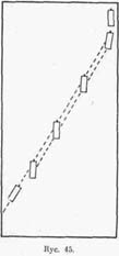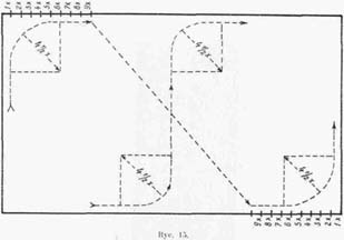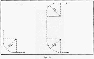 45. "Do mnie".Do objaśnienia czegokolwiek wszystkim jeźdźcom razem instruktor podaje komendę "Do mnie". Wówczas jeźdźcy nie zmieniając chodu najkrótszą drogą podjeżdżają do instruktora i ustawiają się przed nim w półkole w odległości 9 kroków. 46. "Zbiórka".Na komendę "W jeden szereg (chód) - zbiórka" jeźdźcy kierują się najkrótszą drogą chodem poprzednim lub nakazanym i ustawiają się w szereg w odległości 2 kroków za instruktorem. Gdy się wszyscy ustawią w jeden szereg, a nie podano osobnej komendy, jeźdźcy równają się na jeźdźca, który się zatrzymał, kryjąc na instruktora. 47. Wyjeżdżanie z szeregu.Ćwiczenie to ma na celu, aby każdy jeździec, który otrzymał samoistne zadanie, mógł się natychmiast odłączyć od szeregu. Po zebraniu zastępu w jeden szereg instruktor rozkazuje kolejno jeźdźcom wyjeżdżać z szeregu podając im punkt kierunkowy. Wymieniony jeździec wyjeżdża naprzód, prostopadle do szeregu, unikając niepokojenia konia gwałtownym ruchem i jedzie w nakazanym kierunku. Ćwiczenie to może się odbywać z miejsca i w ruchu we wszystkich chodach. Jeździec wywołany z miejsca wyjeżdża zawsze stępem, a w ruchu chodem wyższym. Gdy koń wysunął się zupełnie z szeregu, jeździec przeprowadza go w nakazany chód. Jeźdźcy powinni być przyzwyczajeni do przejeżdżania przez szeregi w kierunku marszu i w kierunku przeciwnym. Prowadzenie konia na wędzidle.48. Stęp marszowy.Stęp marszowy jest chodem, w którym koń kolejno podnosi nogi i stawia je w tym samym porządku. Jeżeli chód rozpoczyna prawa noga tylna, reszta nóg podnosi się w następującym porządku: prawa noga przednia, lewa tylna, lewa przednia, prawa tylna itd. W stępie marszowym koń pomaga sobie szyja, więc należy mu dać możność wyciągnięcia jej bez utracenia łączności z pyskiem. Wykrok powinien być swobodny, pewny i żywy. Stępem marszowym jeździ się stale, z wyjątkiem wypadków, podanych w § 49. Przepisowa szybkość stępa marszowego wynosi l km w 10 min. (100 metrów na minutę). 49. Stęp skócony.W stępie skróconym koń unosi nieco wyżej szyję i nieco cofa głowę wstecz robiąc krótsze wykroki. Prowadząc konia stępem skróconym jeździec lekko przytrzymuje go wodzami, a jednocześnie łydkami nie pozwala na utratę pewności i żywości wykroków. Poza tym sposoby prowadzenia stępem marszowym i stępem skróconym są jednakowe. Stępem skróconym jeździ się w wyjątkowych wypadkach, gdy trzeba chwilowo zmniejszyć szybkość stępa lub gdy trzeba na koniu wykonać w stępie ostry zakręt. 50. Ruszanie z miejsca stępem.Jeżeli jeździec stoi w miejscu, na komendę "Stępem - marsz" rusza stępem równomiernie naciskając łydkami, działając mniej lub więcej energicznie, stosownie do wrażliwości konia, a jednocześnie wodzami pozwala na ruch naprzód. 51. Zatrzymanie.Jeździec jadący stępem na komendę "Zastęp - stój", pozostawiając łydki w normalnej styczności, naciąga wodze, dopóki koń nie stanie. Przy tym ruchu koń powinien się zatrzymać płynnie i giętko oraz, nie cofając się ani przesuwając w bok, stanąć od razu równo na 4 nogach, nie zadzierając ani opuszczając głowy. Od chwili wypowiedzenia hasła "Stój" koń powinien się zatrzymać na przestrzeni l-2 kroków. 52. Cofanie.Na komendę "Cofaj - marsz", która może być podana tylko po komendzie "Zastęp - stój", jeździec naciąga wodze, aż koń zacznie się cofać, a przestaje działać wodzami, gdy się koń cofnął na żądanej przestrzeni. Cofanie należy wykonywać w nawrotach 3-4 kroków aż do komendy "Stój", robiąc między nawrotami krótkie przerwy. Koń powinien się cofać krok za krokiem po linii prostej. Nie powinien się ani zatrzymywać, ani śpieszyć, ani też zarzucać zadem w bok. Jeżeli koń się zatrzymuje, należy wzmocnić działanie wodzy. Jeżeli koń się śpieszy, należy zmniejszyć napięcie wodzy, a jeżeli to nic pomoże, należy przeciwdziałać łydkami. Jeżeli koń zbacza z prostej linii w prawo, należy przeciwdziałać temu naciągnięciem prawej wodzy i naciskiem prawej łydki, jeżeli w lewo - odwrotnie. Cofając konia w rogu, w celu wykonania zakrętu, naciąga się silniej wodzę zewnętrzną i naciska łydką zewnętrzną. 53. Zakręt i wyjeżdżanie kątów ujeżdżalni.Na komendę "W prawo (w lewo) - marsz" jeździec zmienia kierunek o 90°, zwracając konia po łuku o promieniu 4-5 kroków i pozostając w tej samej szybkości; po wykonaniu zakrętu jedzie na wprosi (ryc. 14). Wyjeżdżanie kątów ujeżdżalni wykonywa się jak wyżej (ryc. 14). 54. Zmiana kierunku.Na komendę "Zmiana kierunku - marsz", po przebyciu 9 kroków od kąta wzdłuż długiej ściany ujeżdżalni, jedzie się po przekątnej w ten sposób, aby dojść do przeciwległej ściany na 9 kroków od kąta, po czym się jedzie w przeciwnym kierunku (ryc. 15). Podczas jazdy luzem, na komendę: