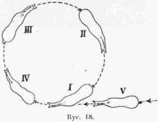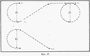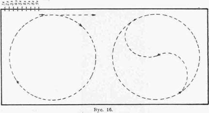55. Zmiana kierunku przez ujeżdżalnię.Na komendę "Zmiana kierunku przez ujeżdżalnię - marsz" jeździec skierowuje konia jak w § 53, jedzie prostopadle do przeciwległej ściany, a dochodząc do niej tak samo zwraca konia, lecz w przeciwną stronę (ryc. 15). Jeżeli jazda odbywa się luzem, jeźdźcy, których komenda zastała przy krótkiej ścianie czworoboku, wykonywają zmianę kierunku przez ujeżdżalnię po dojechaniu do linii długiej ściany. Zmianę kierunku przez ujeżdżalnię na komendę "Za ułanem X zmiana kierunku przez ujeżdżalnię - marsz" można też wykonać od krótkich ścian ujeżdżalni. 56. Jazda po kole.Na komendę "Za ułanem X koło - marsz" wymieniony jeździec jedzie po kole między 2 torami (ścianami), a reszta jedzie jego śladami. 57. Jazda po 2 kołach.Na komendę "Dwa koła - marsz" jeźdźcy, których komenda zastała przed przejściem 9 kroków od kąta ujeżdżalni, tworzą koła na przeciwległych końcach ujeżdżalni między 3 torami (ścianami), a reszta postępuje jak w § 56 (ryc. 16). Na komendę "Na wprost" jeźdźcy rozjeżdżają się z koła lub kół w taki sposób, że znajdujący się, po minięciu krótkich ścian, na stycznych koła (kół) z długimi ścianami pierwsi rozpoczynają jazdę na wprost (ryc. 16). 58. Zmiana kierunku w kole.Na komendę "Za ułanem X zmiana kierunku w kole - marsz" wymieniony jeździec jedzie po linii krzywej, składającej się z 2 łuków w kształcie litery S, przez środek koła (ryc. 16). Przy tym w środku koła, przed przejściem na przeciwny łuk, prowadzi się konia 2-3 kroki na wprost. Reszta jeźdźców prowadzi konie dokładnie śladem czołowego, po czym wszyscy jadą po kole w przeciwnym kierunku. Jeżeli zmiana kierunku w kole (kołach) ma się odbyć kilka razy bez przerwy, wówczas podaje się komendę "Za ułanem X (za ułanami X i Y) zmiana kierunku w kole (kołach) - ćwicz". Do zaprzestania tego ćwiczenia podaje się komendę "Dość". Na komendę " Wolta - marsz" jeździec prowadzi konia po kole o promieniu 4 1/2 kroków, wchodzi z powrotem na tor w tym punkcie, z którego wyszedł, i jedzie dalej na wprost (ryc. 17). Jeżeli jazdę zastępu prowadzi się ze stałymi odległościami, może być podana komenda "Za ułanem X wolta - marsz". Wówczas wymieniony jeździec wykonywa woltę jak wyżej; po dojściu ponownie do ściany trafia na wolne miejsce między 4 a 5 jeźdźcem z kolei i jedzie dalej wzdłuż ściany w poprzednim kierunku; pozostali jeźdźcy kolejno dochodzą do miejsca, skąd czołowy zaczął woltę, i wykonywają to samo (ryc. 18).