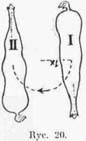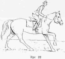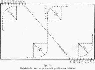 Na komendę "Półwolta w prawo (w lewo) - marsz" jeździec prowadzi konia po łuku połowy wolty, przy czym, zależnie od kierunku jazdy, albo najpierw zatacza pół koła (np. przy jeździe w prawo na komendo "Półwolta w prawo - marsz"), a potem dojeżdża po linii skośnej do toru (ściany) i rozpoczyna jazdę w kierunku przeciwnym, albo na odwrót (np. przy jeździe w prawo na komendę "Półwolta w lewo - marsz"), najpierw odjeżdża po linii skośnej od toru (ściany), a potem zatacza pół koła w kierunku toru (ściany) i jedzie w przeciwnym kierunku (ryc. 17). Linia skośna, po której jeździec prowadzi konia do ściany ujeżdżalni kończąc półwoltę czy teź ją rozpoczynając, powinna wynosić w stosunku do ściany ujeżdżalni (toru) kąt około 30°. Jeżeli zakończenie półwolty wykonanej z odchodzeniem po łuku od ściany wypada w kącie ujeżdżalni, wówczas kąt powinien być ścięty. 61. Zwrot na przodzie.Na komendę "Na przodzie w prawo (w lewo), w tył - marsz", która może być podana tylko po komendzie "Zastęp - stój", jeździec, nie pozwalając koniowi na posunięcie się w przód lub w tył, utrzymuje wodzami jego głowę prosto, przesuwa lewą (prawą) łydkę nieco w tył i naciskając nią przestawia zad konia w prawo (w lewo) o 90°, w prawo (w lewo) w tył o 180°, przy czym oś zwrotu powinna być miedzy przednimi nogami konia. 62. Zwrot zwykły.Na komendę "W prawo (w lewo) zwrot - marsz" jeździec, wzmacniając działanie łydek i wodzy, jednocześnie naciąga prawą (lewą) wodzę i naciskając prawą (lewą) łydką, przesuniętą nieco w tył, zwraca konia o 90° w ten sposób, że środek konia porusza się po łuku o promieniu 1 kroku, przy czym przód konia posuwa się o tyle w prawo (w lewo), o ile zad się posuwa w odwrotną stronę (ryc. 19). Na komendę "W prawo (w lewo) w tył zwrot - marsz" jeździec postępuje jak wyżej, łącząc odpowiednio 2 zwroty w prawo (w lewo) (ryc. 20). Wyżej wymieniony zwrot wykonywa się tylko w stępie i w miejscu. Przy zwrotach w miejscu należy ruszyć o krok naprzód i nie zatrzymując się wykonać zwrot. Po wykonaniu zwrotu w miejscu jeździec zatrzymuje konia aż do komendy "Chód - marsz". Kłus jest chodem, w którym koń odbija takty w równomiernych odstępach czasu, wykonywane przez każdą parę nóg na przekątni. Przepisowa szybkość kłusa wynosi l km w 5 minut (200 m na minutę). Ze względu na zachowanie się jeźdźca rozróżnia się 2 rodzaje kłusa: