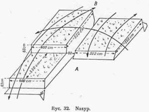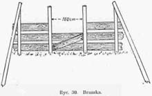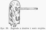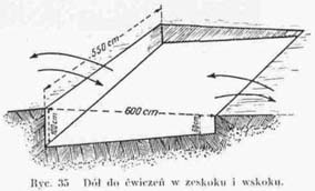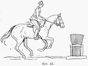 101. Wyrobienie mechaniki skoku.Nauka skakania odbywa się zawsze ze strzemionami. Gdy jeźdźcy czują się w skoku zupełnie pewnie, zaleca się kazać im skoczyć kilka razy bez strzemion, aby nie stracili pewności siebie w razie zgubienia strzemienia lub urwania puśliska. Należy zacząć od przyzwyczajania jeźdźców do przechodzenia w stępie i kłusie przez drągi leżące na ziemi, a później przez kozły wysokości 30-40 cm (ryc. 40). Jeśli w tym wypadku konie nie będą przez drągi i kozły przechodziły, lecz skakały, jeźdźcy, zachowując postawę bez zmiany, muszą się starać podążać rękami za ruchem głowy konia w taki sposób, aby jej nie przeszkadzać i nie tracić łączności z pyskiem. Gdy jeźdźcy już się z tym oswoili, każe się im skakać w galopie przez drągi podniesione do 50 cm i przez rowy szerokości do l m. Przy tych ćwiczeniach należy przyzwyczajać jeźdźców do podążania tułowiem za ruchem całego konia i uważania, aby kolana i łydki ich pozostawały ciągle na tym samym miejscu, a krzyż był zawsze prosty. Przy początkowym nauczaniu skakania przez przeszkody przenośne, a więc o stosunkowo krótkim froncie, należy dostawiać odkosy (ryc. 41). Instruktor uważa, aby od samego początku jeźdźcy zrozumieli, że podczas skoku tułów nic wykonywa żadnych szczególnych ruchów i że podążanie za ruchem konia w skoku polega na przybraniu przez jeźdźca odpowiedniej postawy w odległości kilkunastu kroków przed przeszkodą. Na tej odległości jeździec, jeżeli jedzie w chodzie niższym niż wyciągnięty galop, nieco pochyla tułów ku przodowi, aby uzyskać wyraźne oparcie kolan o siodło (ryc. 23). W tym celu początkowo nakazuje się jeźdźcom jedną ręką trzymać się za grzywę, mniej więcej po środku szyi konia. Przy doskoku (ryc. 25) trzeba pozostawić tułów biernym, gdyż stopniowo, w miarę wyprostowywania się konia, powraca on sam do postawy prostopadłej. Gdy jeźdźcy nabrali pewności przy skakaniu przez pojedyńcze przeszkody, należy rozpocząć skoki przez szereg przeszkód (2-3) rozstawionych w odległości 8 kroków jedna od drugiej. Dzięki równej odległości między przeszkodami ułatwia się jeźdźcom uchwycenie chwili odskoku. Zaleca się przed każdą przeszkodą, a zwłaszcza przed pierwszą, kładzenie na ziemi drąga jako wskazówki. Wskazówkę kładzie się mniej więcej między przeszkodą a przypuszczalnym miejscem odskoku lub lepiej na klockach umyślnie w tym celu przymocowanych do stojaków. W miarę opanowywania przez jeźdźców nauki podążania tułowia za ruchem konia w skoku należy żądać, aby jeźdźcy umieli podążać rękami za ruchem głowy konia bez opierania się o jego szyję, a nawet bez dotykania jej, z jednoczesnym zachowaniem łączności z pyskiem. Po oswojeniu jeźdźców ze skokami w galopie należy ich również ćwiczyć w skakaniu z kłusa. Przy skakaniu z kłusa jeźdźcy przechodzą w ćwiczebny kłus, nie dojeżdżając do przeszkody na 6-8 kroków, przy czym trzymają tułów nieco pochylony ku przodowi, aby uzyskać wyraźne oparcie kolan o siodło. Do skoków z kłusa rozstawia się szereg przeszkód w odległości 7 kroków jedna od drugiej. Dla szeregowców ćwiczenia na szeregu przeszkód stosować rzadziej i tylko jako ćwiczenia gimnastyczne układu tułowia i nauki podążania w skoku. Natomiast dla szeregowców bardziej pożyteczne będą skoki przez pojedyncze przeszkody stałe w żywym tempie wyciągniętego galopu (400 metrów na minutę). 102. Prowadzenie konia na przeszkody.Dalszą uwagę należy skierować nic tylko na naprawianie błędów dosiadu, lecz i na nauczenie prowadzenia konia na przeszkody. Należy wpoić w jeźdźców, że konia się prowadzi na sam środek przeszkody prostopadle, nie dodając ani nie skracając szybkości. Wzrok jeźdźca powinien być skierowany na najwyższy punkt przeszkody w tym miejscu, gdzie koń ma przeskoczyć. Kierunek po przeszkodzie powinien być zachowany ten sam co przed przeszkodą przynajmniej na przestrzeni 30-40 kroków. Wyjątek stanowi konieczność skierowania konia na następną przeszkodę lub zmiana kierunku. Od kadry zawodowej należy od czasu do czasu wymagać wykonania skoku na ukos, dbając o utrzymanie raz obranego kierunku. Dla uniknięcia wyłamań linia kierunkowa, po której się konia prowadzi, i przeszkoda powinna tworzyć kąt niemniejszy jak 45°. Dla osiągnięcia dodatnich wyników w nauce prowadzenia konia na przeszkody, należy tak wyznaczać porządek skakania, aby jeźdźcy skakali pojedynczo, a ich konie nie były pociągane na przeszkodę przez konie poprzedników. Równolegle z prowadzeniem nauki skakania przez szereg przeszkód należy stosować skoki przez pojedyńcze przeszkody, co pozostaje celem szkolenia w skokach. W miarę doskonalenia się jeźdźców wymaga się od nich przechodzenia przez kilka rozmaitych przeszkód rozstawianych, o ile możności, za każdym razem w innym porządku i w innym miejscu. Przy tym należy zwracać uwagę na to, aby jeźdźcy prowadzili konie w równej szybkości, tzn., jeżeli przeszkoda wymaga krótszego lub szerszego chodu, należy na ten chód postawić konia jak najdalej od przeszkody, aby nie zmieniać szybkości przed samym skokiem. Na przeszkody szerokie prowadzi się zwykle konia w chodzie bardziej wyciągniętym, niż na przeszkody wysokie. Zawsze należy pamiętać o tym, że celem nauki skakania nie są przeszkody umyślnie w tym celu zbudowane, lecz spotykane w terenie. Powinno się więc częściej wyprowadzać jeźdźców w teren i tam pokonywać napotykane przeszkody, stosując do tego jazdę "rojem" lub jazdę zastępu ze stałymi odległościami (10-20 kroków). Dzięki temu staje się rzeczą jasną dla jeźdźca, w jakim celu ćwiczono go w skakaniu na ujeżdżalni lub na placu i wyrabia się w nim orientację w prowadzeniu konia na przeszkody poprzednio mu nieznane. Za przeszkody należy uważać niet