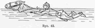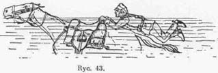 110. Wpław z koniem.Jeżeli się ma ruszyć wpław z koniem osiodłanym, należy odjąć munsztuk; wodze zwisające pod szyją okręcić 2-3 razy jedna około drugiej; przez jedną z nich przeciągnąć podgardle, które się zapina jak zwykle; przesunąć po puśliskach strzemiona do góry i o jedną dziurkę popuścić popręgi. Gdy jeździec wjedzie do wody i nada koniowi kierunek, zupełnie zwalnia wodze i ujmuje grzywę w pobliżu kłębu niedalej, jak na szerokość 2 dłoni od niego. Gdy koń straci grunt pod nogami, jeździec zsuwa się do wody od strony prądu i płynie obok konia. Nie powinien przy tym przy pomocy rąk robić wysiłków, aby się unosić jak najwyżej, przeciwnie zagłębia się w wodę po samą brodę, gdyż w ten sposób ułatwi koniowi utrzymanie się na powierzchni (ryc. 42). Przy prądzie z prawej strony jeździec trzyma się prawej strony konia ujmując lewą ręką grzywę, prawą zaś w razie potrzeby kieruje koniem za pomocą klepania go po policzkach z odpowiedniej strony. Przy prądzie z lewej strony jeździec postępuje odwrotnie. Wodzą należy kierować tylko w razie potrzeby i bardzo oględnie, gdyż nieostrożne pociągnięcie wodzy może spowodować zadarcie łba i przewrócenie się konia. Gdy koń osiągnie na przeciwległym brzegu grunt pod nogami, jeździec znów go dosiada. Można również stosować następujący sposób: jeździec zsuwa się w tył, na zad konia, i płynie trzymając się za tylną część siodła (ryc. 43). Przy przebywaniu wpław niewielkich przestrzeni, mniej więcej do 10 m, jeździec pozostaje na siodle.
