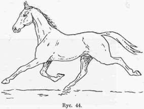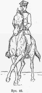 Od oficerów i podoficerów zawodowych należy wymagać ciągłego doskonalenia się we wszystkim, co dotyczy szkolenia szeregowca konno, dążąc do osiągnięcia jak najdokładniejszego wykonania, wyczucia oraz ujeżdżenia ich koni służbowych. Prócz tego oficerowie i podoficerowie na swych koniach służbowych powinni umieć wykonywać wyciągnięty kłus, ciąg i kontrgalop. 112. Wyciągnięty kłus.Wyciągnięty kłus polega nie na uzyskaniu największej szybkości w tym chodzie, lecz na zmuszeniu konia do najdłuższych wykroków. W wyciągniętym kłusie koń wyciąga naprzód przednie nogi sprężyście, całym ruchem łopatki, i robi każdy takt kłusa, stosownie do swej budowy, wykonywając najdłuższe wykroki (ryc. 44). Należy dać koniowi pewną swobodę w pracy szyją, lecz przy dokładnej i czujnej łączności rąk z pyskiem, aby każdej chwili móc regulować szybkość i przeszkodzić przyśpieszaniu taktu. Przy rozpoczynaniu wyciągniętego kłusa łydki działają równomiernym naciskiem i z taką siłą, aby wzbudzić całą energię zadu. Gdy koń już rozpoczął wyciągnięty kłus, łydki pozostają w dość silnej, zależnie od potrzeby, styczności z bokami konia, aby każdej chwili móc przeciwdziałać zmniejszeniu pracy zadu. Ponieważ chód ten jest bardzo trudnym i uciążliwym ćwiczeniem gimnastycznym, należy go stosować w krótkotrwałych nawrotach po rozprężeniu konia i nie powtarzać ponad jeden raz podczas każdej lekcji. Wyciągnięty kłus rozpoczyna się z kłusa i dodanego kłusa; kończy się go w tychże chodach. Przejście z wyciągniętego kłusa lub do tego chodu odbywa się na przestrzeni kilku kroków. Wyciągniętego kłusa nigdy nie wolno stosować w terenie oraz przy prowadzeniu zastępu ze stałymi odległościami. Służy on wyłącznie jako ćwiczenie gimnastyczne dla konia oraz w celu udoskonalenia używania pomocy przez jeźdźca. 113. Ciąg.Ciąg polega na ruchu konia naprzód, przy którym zad posuwa się nie śladem przodu, lecz równolegle do linii, po której się posuwa przód. Odległość między tymi równoległymi liniami wynosi około 1/2 kroku. Przy ciągu głowa konia powinna być ustawiona w kierunku ruchu tak, aby jeździec, bez zmiany swej normalnej postawy w siodle, widział połowę wewnętrznego oka konia. Przy ciągu koń przestępuje zewnętrznymi nogami przez wewnętrzne, posuwając się bardziej naprzód niż w bok. Na komendę "Zmiana kierunku (półwolta w prawo, w lewo), ciąg - marsz" jeździec nadaje koniowi wodzami należyte ustawienie głowy w kierunku bocznego ruchu, wzmacnia działanie obydwóch łydek, przy czym zewnętrzną łydkę trzyma nieco bardziej w tyle niż przy rozpoczynaniu galopu. Wewnętrzna łydka służy do wysyłania konia naprzód, zewnętrzna zaś do przesuwania zadu konia w bok. Po zakończeniu zmiany kierunku (półwolty) lub na komendę "Dość" jeździec ustawia głowę konia prosto, a równym działaniem łydek ustawia zad na śladzie przodu. Ciąg wykonywa się w stępie skróconym i w kłusie. Przy ciągu w kłusie jeździec jedzie kłusem ćwiczebnym. Jeżeli koń zanadto wypada zadem do wewnątrz, jeździec osłabia działanie zewnętrznej łydki, wzmacniając jednocześnie działanie wewnętrznej. Jeżeli koń zanadto wypada przodem do wewnątrz. jeździec powstrzymuje go wodzą zewnętrzną. Rozpoczynając ciąg bądź po przekątnej, bądź przy zakończeniu półwolty, należy początkowo prowadzić konia na wprost, w obranym kierunku, na przestrzeni kilku kroków, a dopiero potem rozpoczynać ciąg (ryc. 45 i 46). 114. Kontrgalop.Kontrgalop polega na tym, że koń, według woli jeźdźca, podczas jazdy w prawo galopuje z lewej nogi, a podczas jazdy w lewo - z prawej. Jako specjalne ćwiczenie kontrgalop wykonywa się tylko w tempie skróconego galopu. Kontrgalop jest prawidłowy tylko wówczas, gdy głowa konia jest ustawiona tak jak w zwykłym skróconym galopie, tzn., jeśli koń galopuje z prawej nogi, jeździec, bez zmiany swej normalnej postawy w siodle, powinien widzieć połowę prawego oka konia (przy galopie z lewej nogi - połowę lewego oka), a zad posuwa się śladem przodu. W kontrgalopie wewnętrzną jest wodza (łydka) będąca po stronie nogi, z której koń galopuje, chociaż w stosunku do kierunku jazdy wodza ta (łydka) jest zewnętrzna. Np. koń posuwa się po kole w prawo w kontrgalopie. W tym wypadku prawa wodza i łydka są zewnętrzne, a lewa wodza i łydka - wewnętrzne. Przy prowadzeniu konia w kontrgalopie pomoce powinny działać z jak największą dokładnością, tj. w taki sposób, aby koń najwyraźniej odczuwał różnicę w napięciu wewnętrznej i zewnętrznej wodzy oraz w ustawieniu wewnętrznej i zewnętrznej łydki. W stosunku do nogi, z której koń ma zagalopować, pomoce działają w taki sam sposób jak przy przejściu w skrócony galop, tj. jak w §§ 82 i 83. Jeżeli koń podczas każdego skoku galopu nic odczuwa stosownego prowadzenia wodzami i łydkami, łatwo przejdzie w kłus lub zmieni nogę. Na zakrętach jeździec, nie zmieniając ustawienia łydek i utrzymując wewnętrzną wodzą ustawienie głowy konia, naciąga zewnętrzną wodzę nieco silniej, wskazując nią potrzebny kierunek. Kontrgalop rozpoczyna się zmianą kierunku, półwoltą i zmianą kierunku przez ujeżdżalnię. Np. jeździec prowadzi swego konia jadąc w prawo skróconym galopem z prawej nogi, zmienia kierunek jednym z wyżej podanych sposobów, lecz nie przechodząc w kłus i nie zmieniając nogi posuwa się dalej w przeciwnym kierunku. W kontrgalopie wykonywa się jazdę dokoła ujeżdżalni, jazdę po kole, wolty, wszystkie zmiany kierunku itp. Do przejścia w kontrgalop używa się komend "Zmiana kierunku, kontrgalop - marsz"; "Półwoltą, kontrgalop - marsz"; "Zmiana kierunku przez ujeżdżalnię, kontrgalop - marsz". Zastępy oficerów i podoficerów zawodowych powinny być o tyle wyszkolone, aby można było prowadzić z nimi jazdę