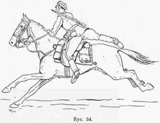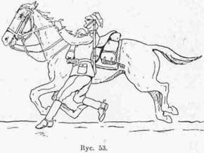 Na komendę "Bez strzemion - z koni" jeździec przekłada wodze wędzidłowe w lewą rękę (jeżeli są wodze munsztukowe, puszcza je na szyję konia), wyjmuje nogi ze strzemion, opiera się obu rękami o przedni łęk, pochylając jednocześnie wyprostowany tułów ku przodowi; pomagając sobie silnym wymachem wyprostowanej prawej nogi, przerzuca ją nad zadem konia; złączywszy prawą nogę z lewą opuszcza się lekko na ziemię, po czyni przybiera postawę zasadniczą z koniem. 133. Wskok na konia w ruchu na linii prostej.Jeździec trzyma lewą (prawą) ręką wodze i garść grzywy, o ile możności, pośrodku szyi konia, a prawą (lewą) za przedni łęk, palcami wewnątrz mając lewe ramię ustawione w tył, aby być zwróconym twarzą w kierunku ruchu; nogi wyprostowane na wysokości przednich nóg konia; biegnąc z koniem "w nogę" odbija się na palcach obydwiema nogami jednocześnie z wewnętrzną przednią nogą konia (ryc. 53) i wskakuje na niego przenosząc prawą (lewą) wyprostowaną nogę przez zad konia.