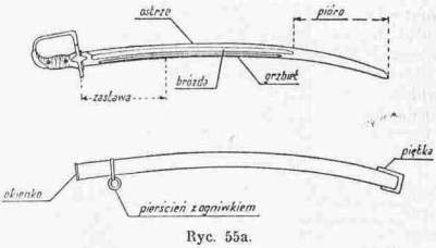 Szabla (ryc. 55 a) dzieli się na głownię i rękojeść. W głowni rozróżniamy: ostrze, grzbiet i pióro. Część głowni (1/3) przy rękojeści nazywa się zastawą szabli.