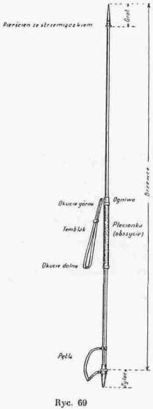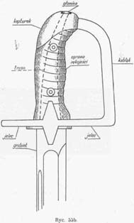 Rękojeść składa się z: jelca, kabłąka, oprawy rękojeści, kapturka i głowicy (ryc. 55 b).