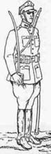 Karabinek wylotem lufy do tyłu, pochylony prawie do położenia poziomego, trzyma szeregowiec lewą ręką za kolbę.