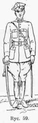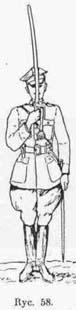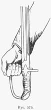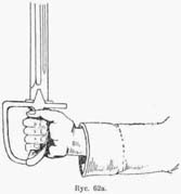Prawą ręką, swobodnie opuszczoną, obejmuje rękojeść kciukiem, palcem wskazującym i środkowym; pozostałe 2 palce lekko zgięte poza rękojeścią szabli, przy czym palec serdeczny naciska rękojeść od tyłu; głownia grzbietem oparta o ramię na szwie rękawa, ostrze skierowane w przód. Jest to postawa zasadnicza z szablą dobytą (ryc. 56).