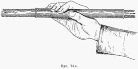 Chwyty "Na pas - broń" i "Do nogi - broń" wykonywa celowniczy w taki sam sposób jak "Na pas - broń" i "Do nogi - broń" zwykłym karabinkiem (§§ 207 i 208).