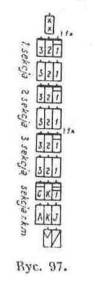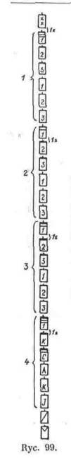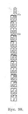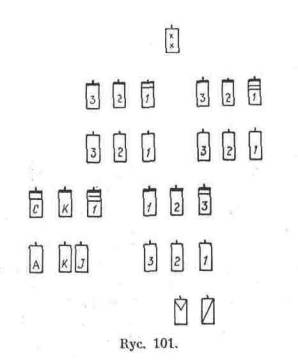253. Zbiórka.Zasadniczym szykiem zbiórki plutonu jest kolumna trójkami. Zbiórkę wykonywa się na komendę "Pluton - (chód) - zbiórka". Można też zebrać pluton w każdym innym szyku; w tym wypadku dowódca daje komendę na przykład "Pluton rozwinięty - (chód) - zbiórka". Sekcje w kolumnie trójkami ruszają chodem nakazanym i formują się za dowódcą plutonu. Jeśli chód nie był podany, zbiórkę wykonywa się w chodzie poprzednim (z miejsca kłusem). Dla ułatwienia zbiórki dowódca plutonu zmniejsza chód o jeden stopień, albo się zatrzymuje. 254. Kolumna trójkami.Kolumny trójkami używa się do zbiórki i marszu. Ustawienie plutonu - patrz ryc. 97. Jeźdźcy odliczają do trzech w każdej sekcji na zasadach wskazanych dla sekcji (§ 246). Pluton w kolumnie trójkami wsiada i zsiada z koni zgodnie z § 246. Pluton zawraca w prawo, w lewo i w tył na komendę "Pluton w prawo (w lewo) - (w tył) - marsz" lub na odpowiedni znak i przykład dowódcy; kolumna wówczas dąży za dowódcą, jeźdźcy drugich szeregów w sekcjach utrzymują kierunek swoich poprzedników, a jeźdźcy pierwszych szeregów poruszają się śladem jeźdźców sekcji poprzedzającej. W razie potrzeby dowódca może podać komendę "Pluton pojedynczo w tył - marsz"; wtedy jeźdźcy każdego szeregu, luzując od środkowego w prawo i w lewo wykonują pojedynczo zwrot zwykły w lewo w tył. Pluton również może być zwrócony w tył na komendę "Pluton sekcjami w prawo (w lewo) - (w tył) - marsz", a wtedy każda sekcja wykonywa zwrot w prawo lub w lewo w tył. Jeźdźcy drugich szeregów poruszają się wówczas na skos, kryjąc swoich poprzedników. Jeźdźcy ostatniej dwójki wykonują zwrot jak sekcja. Dowódca plutonu wykonuje zwrot po czym zajmuje swe miejsce na czele plutonu. 255. Kolumna dwójkami.Kolumny dwójkami używa się do marszu po drogach twardych, dla wykorzystania miękkich i wąskich boków drogi. Ustawienie plutonu - patrz ryc. 98. Przejście plutonu z kolumny trójkami do kolumny dwójkami wykonywa się na komendę "Pluton dwójkami (chód) - marsz"; pierwsza sekcja wyciąga się, poruszając się za dowódcą plutonu chodem jego konia albo chodem poprzednim lub nakazanym, a pozostałe sekcje zatrzymują się lub zmniejszają chód o jeden stopień w stosunku do poprzedniego lub nakazanego, po czym wyciągają się w kolumnę dwójkami przechodząc w chód sekcji czołowej. Przejście plutonu z kolumny dwójkami do kolumny trójkami wykonywa się na komendę "Pluton trójkami (chód) - marsz". Dowódca plutonu posuwa się chodem poprzednim, a wszystkie sekcje maszerując chodem dowódcy plutonu przechodzą natychmiast do kolumny trójkami, po czym sekcje 2, 3 i 4 dochodzą chodem wyższym na odległość jednego kroku do sekcji czołowej. Pluton w kolumnie dwójkami wsiada i zsiada z koni oraz zmienia kierunki marszu jak w kolumnie trójkami. 256. Kolumna po jednemu.Kolumny po jednemu używa się do przesączania w terenie od zakrycia do zakrycia i wyjątkowo do marszu. Ustawienie plutonu - patrz ryc. 99. Pluton w kolumnie po jednemu przechodzi do kolumny trójkami, dwójkami i odwrotnie oraz zmienia kierunki marszu, stosując się do zasad podanych w § 255. 257. Szyk rozwinięty.Szyku rozwiniętego używa się do szarży i przeglądów. Ustawienie plutonu - patrz ryc. 100. Na komendę "Do trzech - odlicz" jeźdźcy plutonu odliczają od prawego skrzydła do trzech, zgodnie z § 246. Do wsiadania na koń pluton ustawia się pieszo w szyku rozwiniętym, dowódca staje konno w odległości dwóch kroków przed środkiem plutonu, a jeźdźcy trzymają swoje konie, zgodnie z § 11. Na zapowiedź komendy "Pluton do wsiadania" dowódca plutonu oraz jeźdźcy l i 3 sekcji wysuwają się na przód na trzy długości koni, po czym jeźdźcy każdego szeregu we wszystkich sekcjach luzują od środkowego w prawo i w lewo; na hasło "Na koń" wszyscy jednocześnie wsiadają na koń. Następnie bez dodatkowej komendy jeźdźcy każdego szeregu w sekcjach łączą do środkowego na odstęp czucia strzemieniem, a sekcje 2 i 4 wychodzą na wysokość sekcji l i 3 zajmując swoje miejsce w szyku rozwiniętym plutonu (ryc. 101). Zastępca dowódcy plutonu oraz goniec zajmują swoje miejsca za plutonem. Zsiadanie z koni odbywa się w sposób podobny do wsiadania. Po zejściu z koni szeregowi każdej sekcji pozostają rozluzowani, a sekcje l i 3 są wysunięte na przód na trzy długości konia. Dla sformowania szyku rozwiniętego plutonu spieszonego dowódca daje komendę "Równaj"; wówczas jeźdźcy każdego szeregu w sekcjach łączą do środkowego, sekcje 2 i 4 wysuwają się na wysokość sekcyj nieparzystych zajmując swoje miejsca w szyku rozwiniętym plutonu, po czym zachowują się zgodnie z $ 32. Zastępca dowódcy plutonu i goniec zachowują się jak przy wsiadaniu na koń. Równanie plutonu w szyku rozwiniętym odbywa się na komendę "Równaj"; jeździec kierunkowy ustawia się w odległości dwóch kroków za dowódcą plutonu. Wszyscy jeźdźcy plutonu zajmują swoje miejsca, ustawiając konie prostopadle do linii frontu plutonu i równają na kierunkowego. Jeźdźcy drugiego szeregu, stając w odległości dwóch kroków za pierwszym, kryją swoich poprzedników. To samo wykonują jeźdźcy trzeciego szeregu w stosunku do drugiego szeregu. Na komendę "Baczność" - jeźdźcy przybierają postawę zasadniczą. Gdy pluton jest ustawiony z końmi pieszo w szyku rozwiniętym, na komendę "Równaj" jeźdźcy zachowują się zgodnie z § 32. Na komendę "Pluton - cofaj - marsz" dowódca plutonu i wszyscy jeźdźcy cofają się jednocześnie aż do komendy "Stój". Cofanie wykonywa się tylko na kilka kroków. 258. Zmiana kierunku w szyku rozwiniętym.Dla zmiany kierunku dowódca prowadzi swój pluton za sobą znakiem, kierunkiem i chodem swojego konia, albo daje komendę "Pluton w prawo (w lewo) - (w tył) - (chód) - marsz", wykonując osobiście półwoltę o promieniu równy