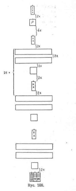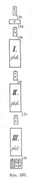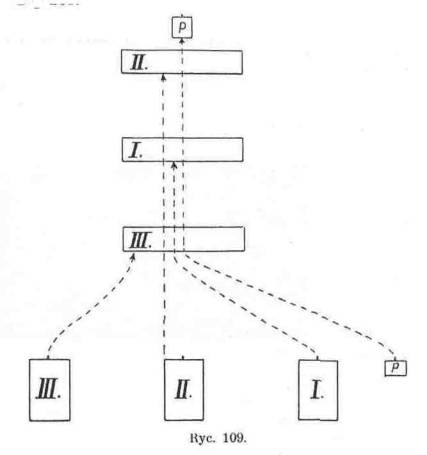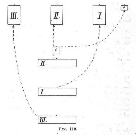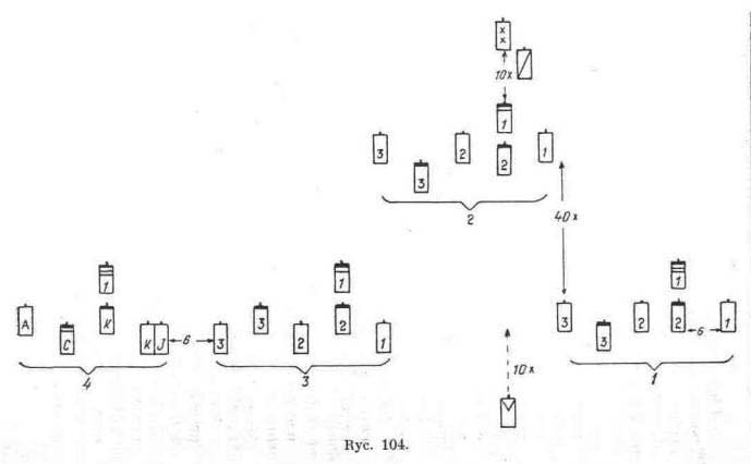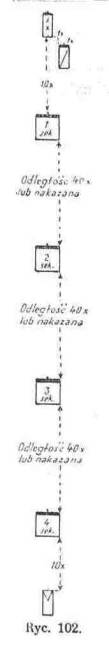 276. Zbiórka.Zasadniczo zbiórkę szwadronu wykonuje się w linii plutonów trójkami w zwykłej kolejności plutonów. Dowódca drugiego plutonu staje w odległości 20 kroków za dowódcą szwadronu, pierwszy pluton w prawo od drugiego pluton trzeci i czwarty w lewo od drugiego. Poczet dowódcy szwadronu, jeśli nie jest za dowódcą, zajmuje miejsce w odstępie 4 kroków na prawo od plutonu prawoskrzydłowego. Wachmistrz szef oraz podoficer sanitarny i weterynaryjny zajmują miejsca w odległości dwóch kroków za plutonem kierunkowym. Na komendę "Szwadron (chód) - zbiórka" do wódca każdego plutonu prowadzi swój pluton w kolumnie trójkami najkrótszą drogą kłusem lub chodem nakazanym na miejsce, które ma zająć w szyku. Jeżeli dowódca szwadronu chce wykonać zbiórkę w innym szyku, zaznacza to w komendzie. 277. Linia plutonów trójkami.Linii plutonów trójkami używa się do zbiórki i marszu w terenie poprzerzynanym. Plutony w kolumnach trójkami stają na jednej wysokości w odstępach równych szerokości frontu rozwiniętego plutonu, licząc od prawego skrzydła jednego plutonu do prawego skrzydła następnego plutonu (ryc. 106). Poczet dowódcy, jeśli nie jest za dowódcą, staje w odstępie 4 kroków od plutonu prawoskrzydłowego. Wachmistrz szef oraz podoficer sanitarny i weterynaryjny zajmują miejsca w odległości dwóch kroków za plutonem kierunkowym. Linię plutonów trójkami formuje się z każdego szyku na komendę "Szwadron linia plutonów trójkami - (chód) - marsz" lub na odpowiedni znak. Szykiem ścieśnionym nazywa się szyk linij plutonów trójkami, gdy odstępy między plutonami wynoszą 6 kroków. Szwadron przechodzi w szyk ścieśniony na komendę "Szwadron linia plutonów trójkami - szyk ścieśniony (chód) - marsz". Dowódca drugiego plutonu porusza się w odległości 20 kroków za dowódcą szwadronu, który utrzymuje kierunek. Inni dowódcy plutonów maszerują na wysokości dowódcy drugiego plutonu. Linia plutonów trójkami zmienia kierunek na znak dowódcy szwadronu lub po wskazaniu nowego punktu kierunkowego. Dowódca drugiego plutonu posuwa się w ślad za dowódcą szwadronu lub w kierunku nakazanym. Dowódcy pozostałych plutonów zwiększają lub zmniejszają tempo chodu stosownie do zajmowanego miejsca i prowadzą swoje jednostki najkrótszą drogą w nowym kierunku, stosując się do drugiego plutonu i nie starając się przy tym o utrzymanie normalnych odstępów, które biorą przy zakończeniu ruchu. Szwadron wykonuje zwrot w tył na komendę "Szwadron plutonami w prawo (w lewo) w tył - marsz" lub na odpowiedni znak; każdy pluton wykonuje zwrot w tył, stosując się do przepisów zawartych w § 254. Szwadron będący w linii plutonów trójkami wsiada na koń i zsiada z koni na zasadach wskazanych dla plutonu. 278. Kolumna trójkami, dwójkami i po jednemu.Kolumny trójkami, dwójkami i wyjątkowo kolumny po jednemu używa się do marszu. W kolumnie trójkami plutony stają bezpośrednio jeden za drugim w odległości jednego kroku i w szyku - zgodnie z przepisami zawartymi w § 254 (ryc. 107). Dowódcy plutonów w odległości jednego kroku przed swymi plutonami. Zasadniczo dowódca szwadronu zajmuje miejsce na czele kolumny, za nim w odległości jednego kroku porusza się poczet w kolumnie trójkami, za pocztem w odległości jednego kroku dowódca plutonu czołowego. Podczas marszu dowódcy plutonów mogą zmieniać swoje zasadnicze miejsca w kolumnie, stając na jednym ze skrzydeł swojego plutonu, żeby mogli przestrzegać porządku i karności marszu. Wachmistrz szef oraz podoficer sanitarny i weterynaryjny zajmują miejsca w odległości jednego kroku za ostatnim plutonem. Kolumna dwójkami i po jednemu formuje się na wyżej podanych zasadach, przy czym poczet dowódcy i plutony są w kolumnach dwójkami lub po jednemu (§ 255 i 256). Przejście szwadronu z kolumny trójkami do kolumny dwójkami (po jednemu) i odwrotnie wykonywa się na zasadach podanych dla plutonu. Szwadron w kolumnie trójkami, dwójkami i po jednemu wsiada na koń i zsiada z koni na zasadach wskazanych dla plutonu. Szwadron w kolumnie marszowej wykonywa zwrot w tył na komendę "Szwadron w prawo (w lewo) - w tył marsz" lub "Szwadron sekcjami (plutonami) w prawo (w lewo) w tył - marsz"; każdy pluton wykonywa w tył zwrot, stosując się do przepisów zawartych w § 254. Szwadron stojący w miejscu lub poruszający się w linii plutonów trójkami przechodzi w kolumnę trójkami (dwójkami lub po jednemu) - na komendę "Szwadron trójkami (dwójkami, po jednemu) - (chód) - marsz" lub "Szwadron na X pluton trójkami (dwójkami, po jednemu) - (chód) - marsz". Poczet dowódcy (jeśli nie jest za dowódcą), a za nim kierunkowy lub wskazany pluton, wysuwa się za dowódcą szwadronu, pozostałe plutony wchodzą kolejno w kolumnę, przy czym, jeżeli sformowanie kolumny trójkami nastąpiło na pluton kierunkowy, to po nim włącza pluton prawoskrzydłowy, a następnie lewoskrzydłowy. Szwadron z linii plutonów trójkami może przejść w kolumnę trójkami w bok na komendę "Szwadron plutonami w prawo (w lewo) - marsz". Plutony wykonywają zwrot pod kątem 90°. Kolumna trójkami może się rozwinąć w linię plutonów trójkami w każdym kierunku. Dowódca szwadronu zwraca, jeśli zachodzi potrzeba, czoło kolumny w nowym kierunku, po czym daje komendę "Szwadron linia plutonów trójkami (chód) - marsz". Dowódca szwadronu wysuwa się naprzód na 20 kroków z miejsca kłusem, a w marszu chodem o jeden stopień wyższym, po czym przechodzi w chód poprzedni. Poczet dowódcy, jeśli ma pozostać przy szwadronie, przesuwa się w prawo z miejsca kłusem, w marszu chodem o jeden stopień wyższym lub nakazanym dla zajęcia swojego miejsca na prawym skrzydle szwadronu. Dowódca plutonu czołowego posuwa się za dowódcą szwadronu lub w nakazanym kierunku z miejsca stępem, a w marszu chodem poprzednim. Dowódcy następnych plutonów pro