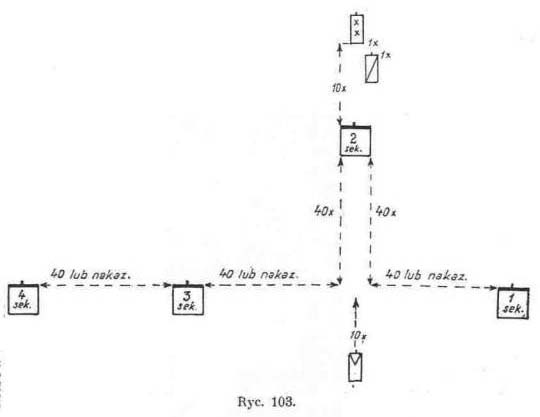 262. Ogólne zasady poruszeń w szykach luźnych.Szyki luźne, zmniejszając widoczność i straty, służą do marszu pod ogniem i do walki. Z drugiej strony ułatwiają przygotowanie szybkiego spieszenia do walki oraz rozczłonkowanie koniowodów przed rozpoczęciem walki ogniowej. Szerokość frontu plutonu w szykach luźnych wynosi 150 - 200 kroków. Goniec dowódcy plutonu posuwa się w odległości i odstępie jednego kroku za swoim dowódcą. Zastępca dowódcy plutonu we wszystkich szykach luźnych pozostaje za plutonem. Gdy pluton wykonywa zwrot w tył, zastępca dowódcy plutonu pozostaje na czele plutonu do chwili, aż dowódca plutonu będzie mógł zająć swoje miejsce przed plutonem, po czym staje za plutonem. We wszystkich szykach luźnych plutonu sekcje mogą przybierać szyki wymienione w § 245. Jeśli przy rozwijaniu się z szyku zwartego dowódca plutonu nie wskazuje szyku dla sekcyj, wówczas zachowują one szyk poprzedni. Gdy zachodzi potrzeba przybrania przez sekcje innego szyku, dowódca plutonu wskazuje to w swojej komendzie. Z chwilą przejścia plutonu w szyk luźny dowódcy sekcyj stają zawsze na czele swoich oddziałów. Dowódca sekcji kierunkowej utrzymuje nakazany kierunek albo maszeruje w odległości 10 kroków za dowódcą plutonu. Przejście plutonu z szyku rozwiniętego w kolumnę sekcyj wykonywa się od prawego lub lewego skrzydła, zgodnie z zasadami podanymi w § 259. Przy przejściu z kolumny do linii sekcyj sekcja czołowa porusza się na prawo w skos, żeby dać możność sekcji drugiej (kierunkowej) wysunąć się naprzód i zająć swoje miejsce za dowódcą plutonu. Przed przejściem w szyk luźny dowódca plutonu zwraca swoją jednostkę w tym kierunku, w którym ma zamiar poruszać się po rozwinięciu. Jeżeli odstęp i odległość nie zostały podane, wówczas należy przyjmować między sekcjami 40 kroków odległości i 40 kroków odstępu. W linii sekcyj i w linii harcowników jednostka kierunkowa wysuwa się naprzód przed inne sekcje na odległość około 40 kroków. Jeżeli chód w komendzie nie był podany, wówczas rozwijanie w szyk luźny odbywa się galopem. Dla zmiany kierunku dowódca plutonu zwraca jednostkę kierunkową w nowym kierunku, a inne jednostki dążą na swoje miejsca najkrótszą drogą, nie troszcząc się o zachowanie odstępów i odległości. Jeżeli okoliczności wymagają przesunięcia plutonu będącego w szyku luźnym w kierunku jednego ze skrzydeł lub wykonania zwrotu w tył, dowódca plutonu podaje komendę "Pluton sekcjami w prawo (w lewo) - (w tył) - marsz", wskazując w razie potrzeby nową jednostkę kierunkową. Po wykonaniu zwrotu w tył dowódca plutonu zawsze wyznacza nową sekcję kierunkową. We wszystkich szykach luźnych jeźdźcy trzymają lance na udo. 263. Kolumna sekcyj.Kolumny sekcyj używa się do przebywania małymi grupami ostrzeliwanego terenu, a szczególnie cieśniny (ryc. 102). Na komendę "Pluton kolumna sekcyj (szyk) - (odległość x kroków) (chód) - marsz" sekcja kierunkowa posuwa się galopem lub chodem nakazanym w kierunku podanym przez dowódcę plutonu, przechodząc w inny szyk, jeśli to było zaznaczone w komendzie. Druga sekcja zajmuje miejsce za pierwszą w podanej odległości, zmieniając w razie potrzeby swój szyk, po czym przechodzi w chód sekcji kierunkowej. Sekcja trzecia i czwarta postępuje jak druga. 264. Linia sekcyj.Linii sekcyj używa się do zmniejszenia widoczności i strat pod ogniem piechoty, artylerii i z samolotów oraz do szarży lub spieszania (ryc. 103). Na komendę "Pluton linia sekcyj (szyk) - (odstęp x kroków) (chód) - marsz" sekcja kierunkowa posuwa się galopem lub chodem nakazanym w kierunku podanym przez dowódcę plutonu, przechodząc w inny szyk, jeśli to było zaznaczone w komendzie. Inne sekcje zajmują swoje miejsca na prawo i lewo od sekcji kierunkowej w kolejności numerów sekcyj. 265. Linia harcowników.Linii harcowników używa się do marszu pod skutecznym ogniem piechoty, do zwiadów i szarży (ryc. 104). |