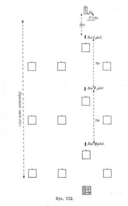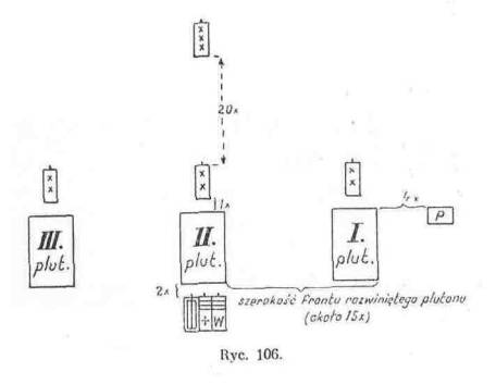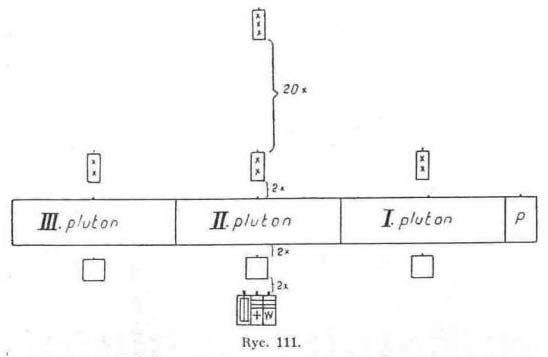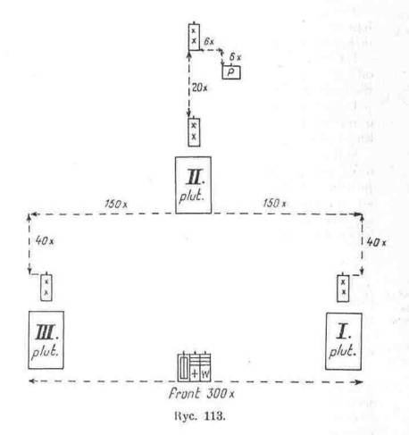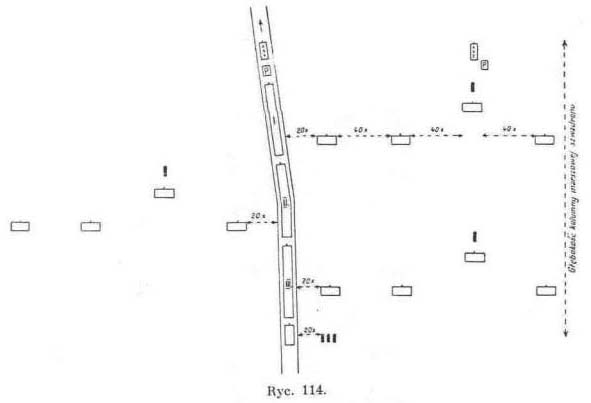 286. Ogólne zasady poruszeń w szykach luźnych.Zasady poruszeń w szykach luźnych oraz ich użycie przepisane dla plutonu stosują się również do szwadronu (§ 262). We wszystkich szykach luźnych szwadronu plutony mogą być w szykach zwartych lub luźnych zależnie od okoliczności. Poczet posuwa się za dowódcą szwadronu w schodach w prawo w odległości i odstępie 6 kroków. Przechodząc w linię harcowników poczet rozsypuje się zawsze w prawo w ten sposób, żeby szeregowiec lewoskrzydłowy poruszał się w odległości i odstępie 6 kroków za dowódcą szwadronu. Jeżeli odstępy i odległości nie były podane w komendzie, wówczas należy przybierać między dowódcami plutonów 150 kroków odległości i 150 kroków odstępu. Szerokość i głębokość frontu szwadronu w szykach luźnych może wynosić do 500 kroków (400 metrów). Przejście z szyku rozwiniętego lub linii plutonów trójkami w kolumnę plutonów oraz z kolumny marszowej i plutonów rozwiniętych w linię plutonów wykonywa się zgodnie z §§ 278, 279 i 282. Gdy dowódca szwadronu prowadzi osobiście szwadron, dowódca plutonu kierunkowego porusza się za nim w odległości 20 kroków. 287. Kolumna plutonów.Na komendę "Szwadron kolumna plutonów (szyk) odleglość x kroków (chód) - marsz" pluton kierunkowy lub wskazany posuwa się za dowódcą szwadronu lub we wskazanym kierunku, przybierając nakazany szyk i chód. Pozostałe plutony zajmują kolejno swe miejsca w kolumnie, biorąc nakazaną odległość, szyk i chód lub stosują się przez naśladowanie do chodu i szyku plutonu kierunkowego (ryc. 112). 288. Linia plutonów.Na komendę "Szwadron linia plutonów (szyk) odstęp x kroków (chód) - marsz" pluton kierunkowy lub wskazany posuwa się za dowódcą szwadronu lub we wskazanym kierunku, wysuwając się naprzód przed inne plutony na odległość około 40 kroków (ryc. 113). Dowódca szwadronu wskazuje dowódcy plutonu kierunkowego szyk, chód i w miarę potrzeby przedmiot natarcia lub przedmiot w terenie do osiągnięcia. Pozostałe plutony odchodzą w prawo i w lewo na wskazany odstęp i przybierają nakazany szyk lub naśladują szyk i chód plutonu kierunkowego. Jeśli po rozwinięciu w linię plutonów dowódca szwadronu wskazuje plutonowi kierunkowemu inny szyk i chód, pozostałe plutony przez naśladowanie stosują się do szyku i chodu plutonu kierunkowego. Podczas poruszeń w linii plutonów odstępy i odległości można zmieniać na komendę "x kroków odstęp" (odległość). Na tę komendę plutony biorą nowe odstępy lub odległości, stosując się jeden do drugiego, a przede wszystkim do plutonu kierunkowego. Poza tym szwadron może przez odpowiednie podanie odstępów i odległości przybrać taki szyk, jakiego wymaga położenie i teren. Szwadron powinien być tak wyszkolony, żeby mógł przejść w linię plutonów i do różnych ugrupowań z każdego szyku i aby był zdolny poruszać się w tych szykach we wszystkich chodach i w różnorodnym terenie, przebywając przestrzenie po kilka kilometrów. 289. Szyk w wypadku napadu lotniczego.Szwadron poruszający się w kolumnie marszowej lub w innym szyku zwartym w razie napadu lotniczego na komendę lub sygnał na trąbce "Lotnik" formuje szyk wskazany na ryc. 114. |