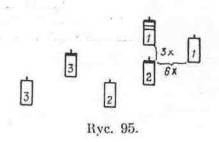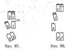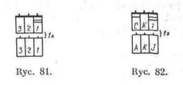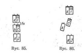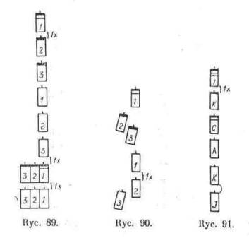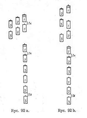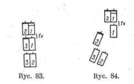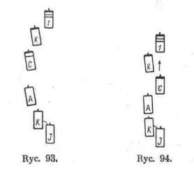 246. Kolumna trójkami.Kolumny trójkami używa się do zbiórki i marszu. Jeźdźcy ustawiają się kolejno według numerów obok siebie w dwa szeregi po trzech, zgodnie z miejscem im wyznaczonym, w odległości jednego kroku (75 cm) między szeregami. Odległość liczy się od nasady ogona konia poprzednika do nosa konia zaplecznika. Odstęp między jeźdźcami - czucie strzemieniem (ryc. 81 i 82). Dowódca sekcji staje jako numer pierwszy w pierwszym szeregu, numery drugie w obu szeregach są koniowodami, pozostali szeregowcy zajmują miejsca numerów trzecich i numeru pierwszego w drugim szeregu. W sekcji ręcznego karabina maszynowego celowniczy staje jako numer trzeci pierwszego szeregu, a amunicyjny jako numer trzeci drugiego szeregu. Na hasło komendy "Do trzech - odlicz" jeźdźcy pierwszego szeregu zwracają głowy w prawo, z wyjątkiem prawoskrzydłowego, który zwraca głowę w lewo, i kolejno odliczają (raz, dwa, trzy), w chwili wymawiania liczby zwracając głowę w lewo w stronę sąsiada. Jeźdźcy drugiego szeregu biorą numery swoich poprzedników. Pierwszy szereg sekcji składa się zawsze z 3 jeźdźców. Jeśli w sekcji jest tylko 5 jeźdźców, ślepą jest pierwsza rota, jeśli jest 4 jeźdźców, ślepymi rotami są pierwsza i trzecia. Gdy jeździec pierwszego szeregu opuszcza swoje miejsce, zajmuje je natychmiast zaplecznik. Gdy sekcja jest w kolumnie trójkami, wówczas jeźdźcy wsiadają lub zsiadają z koni, luzując w lewo i w prawo od numeru drugiego. Na zapowiedź komendy do wsiadania lub zsiadania z koni jeźdźcy się rozluzowują, po czym na hasło wszyscy jednocześnie wsiadają lub zsiadają z koni. Po wejściu na koń jeźdźcy biorą przepisowe odstępy miedzy sobą bez komendy dodatkowej. Po zejściu z koni jeźdźcy biorą przepisowe odstępy między sobą na komendę "Równaj", w przeciwnym razie pozostają rozluzowani. 247. Kolumna dwójkami.Kolumny dwójkami używa się do marszu po drogach twardych, dla wykorzystania miękkich i wąskich boków drogi. Sekcja z kolumny trójkami przechodzi w kolumnę dwójkami na komendę "Sekcja dwójkami (chód) - marsz". Gdy wyciąganie kolumny odbywa się z miejsca, numery pierwszy i drugi pierwszego szeregu oraz numer pierwszy drugiego szeregu ruszają stępem lub chodem nakazanym na wprost lub w podanym kierunku, a inni jeźdźcy pozostają chwilowo na miejscu, po czym numer trzeci pierwszego szeregu porusza się na prawo w skos, kryjąc numer drugi pierwszego szeregu. Numer drugi i trzeci drugiego szeregu poruszają się również na prawo w skos, kryjąc sformowane już dwójki sekcji (ryc. 83 i 84). Odległość między szeregami wynosi jeden krok, licząc od nasady ogona konia poprzednika do nosa konia zaplecznika. Gdy sekcja jest w marszu, numer pierwszy i drugi pierwszego szeregu oraz numer pierwszy drugiego szeregu jadą chodem poprzednim lub nakazanym, pozostali jeźdźcy zatrzymują się, jeśli ruch odbywa się w stępie, albo zmniejszają chód o jeden stopień w stosunku do poprzedniego lub nakazanego, jeśli ruch odbywa się w innym chodzie, po czym zajmują swoje miejsca w kolumnie. W sekcji ręcznego karabina maszynowego wyciąganie kolumny dwójkami z kolumny trójkami odbywa się podobnie jak w sekcji liniowej z tą różnicą, że celowniczy zajeżdża na prawo w skos i staje z prawej strony amunicyjnego, kryjąc dowódcę sekcji, a za nimi porusza się koniowód drugiego szeregu z koniem jucznym (ryc. 85 i 86). Przejście z kolumny dwójkami do kolumny trójkami wykonywa się na komendę "Sekcja trójkami (chód) - marsz". Gdy skracanie kolumny odbywa się z miejsca, numer pierwszy i drugi pierwszego szeregu oraz numer pierwszy drugiego szeregu ruszają 3 kroki stępem, po czym się zatrzymują. Numer trzeci, pierwszego szeregu oraz numer drugi i trzeci drugiego szeregu, poruszając się na lewo w skos, zajmują swoje miejsca w kolumnie (ryc. 87). Gdy sekcja jest w marszu, numer pierwszy i drugi pierwszego szeregu oraz numer pierwszy drugiego szeregu poruszają się naprzód chodem poprzednim, a pozostali jeźdźcy zajmują swoje miejsca w kolumnie chodem o jeden stopień wyższym lub nakazanym. W sekcji ręcznego karabina maszynowego przejście z kolumny dwójkami w kolumnę trójkami odbywa się podobnie jak w sekcji liniowej z tą różnicą, że amunicyjny i celowniczy, jadąc na lewo w skos, zajmują swoje miejsca z lewej strony koniowodów (ryc. 88). 248. Kolumna po jednemu.Kolumny po jednemu używa się tylko wyjątkowo do marszu, natomiast zasadniczo do przesączania niewielkich oddziałów (od zakrycia do zakrycia) (ryc. 89). Sekcja z kolumny trójkami lub dwójkami na komendę "Sekcja po jednemu (chód) - marsz" przechodzi w kolumnę po jednemu w sposób następujący: numery pierwszy, drugi i trzeci pierwszego szeregu wyciągają się kolejno jeden za drugim, w odległości jednego kroku między sobą na wprost lub w nakazanym kierunku, po czym wykonują to samo numery pierwszy, drugi i trzeci drugiego szeregu, stając w rzędzie za jeźdźcami pierwszego szeregu (ryc. 89 i 90). Użycie chodów jest takie same jak w kolumnie dwójkami. Sekcja ręcznego karabina maszynowego z kolumny trójkami lub dwójkami przechodzi w kolumnę po jednemu podobnie jak sekcja liniowa z tą różnicą, że jeźdźcy drugiego szeregu wyciągają się od lewego (amunicyjny, za nim koniowód z koniem jucznym) (ryc. 91). Sekcja z kolumny po jednemu na komendę "Sekcja trójkami (chód) - marsz" przechodzi w kolumnę trójkami w sposób następujący: numery drugi i trzeci pierwszego szeregu poruszają się na lewo w skos, stając na wysokości i obok numeru pierwszego szeregu pierwszego, a numery drugi i trzeci drugiego szeregu wykonywają to samo stając obok numeru pierwszego drugiego szeregu, po czym cały drugi szereg dochodzi na odległość jednego kroku do pierwszego szeregu (ryc. 92a). Użycie chodów jest takie same jak przy przejściu z kolumny dwójkami do kolumny trójkami. Sekcja z k