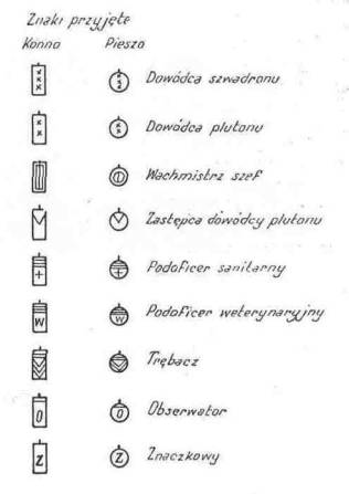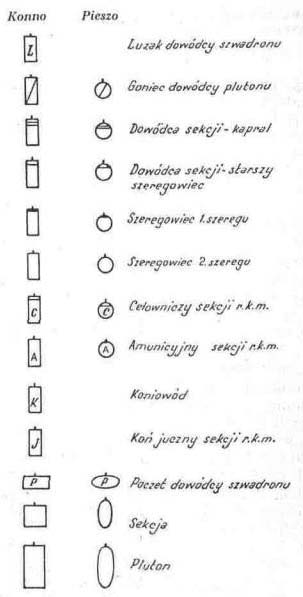 ![]() Regulamin kawalerii.ROZDZIAŁ D. OGÓLNE ZASADY MUSZTRY ODDZIAŁÓW I ŚRODKI DOWODZENIA.234. Zasady ogólne.Szkolenie zbiorowe w mustrze ma na celu przygotowanie oddziałów kawalerii do wykonywania poruszeń, zmiany szyków i manewrowania na polu walki. Zasady poruszeń oraz komendy są jednakowe w szyku konnym i pieszym. Sprawne wykonywanie poruszeń zależy od porządku, utrzymania kierunku, równomiernego chodu oraz prostego i szybkiego formowania szyków. Wszystkie oddziały powinny być doskonale wyćwiczone konno i pieszo w stosowaniu poruszeń ze zmianami szyków, we wszelkich chodach i najróżnorodniejszych warunkach terenowych. 235. Prowadzenie oddziałów.Dowódca prowadzi swój oddział, nakazując kierunek, szyk i chód. Za nim porusza się jednostka kierunkowa. Jednostka kierunkowa swoim szykiem i chodem wskazuje wolę dowódcy. Inne oddziały naśladują ruch i szyk jednostki kierunkowej, jednocześnie lub kolejno. Przez nazwę "jednostka kierunkowa" rozumie się: w pułku - szwadron, w szwadronie - pluton, w plutonie - sekcja, w sekcji - szeregowiec. W kolumnach jednostką kierunkową jest jednostka czołowa. Jednostką kierunkową w szykach rozwiniętych jest jednostka środkowa albo znajdująca się na prawo od środka. Dowódca może również wyznaczyć jako kierunkową jakąkolwiek inną jednostkę. W szykach luźnych w oddziałach większych od sekcji jednostka kierunkowa jest wysunięta naprzód przed inne oddziały. Dla uzyskania swobody ruchów dowódca może powierzyć prowadzenie oddziału jednemu z podwładnych albo wskazać kierunek i chód jednostce kierunkowej, dając znak odłączenia. Należy to często stosować podczas szkolenia, gdyż wówczas dowódca może zająć dogodne miejsce do obserwacji poruszeń i poprawiania popełnionych błędów. 236. Używanie chodów przy rozwijaniu i wyciąganiu szyków.Rozwinięcie odbywa się na osobę dowódcy lub we wskazanym kierunku i zasadniczo w chodzie wyższym. W zasadzie przed rozwinięciem oddziału dowódca wskazuje kierunek i podaje komendę lub znak do rozwinięcia, a prócz tego może nadać chód oddziałowi. Jeżeli nowy chód nie był podany w komendzie, oddział czołowy zasadniczo chodu nie zmienia, a z miejsca porusza się stępem, inne zaś oddziały dążą na przeznaczone miejsca najkrótszą drogą, chodem wyższym, a z miejsca kłusem. Jeśli w komendzie był wskazany chód, odnosi się on do oddziałów rozwijających się. W tym wypadku oddział czołowy reguluje chód w sposób następujący: przy rozwijaniu się z miejsca stępem wysuwa się naprzód tym chodem na odległość rozwiniętego frontu oddziału i zatrzymuje się. Przy rozwijaniu się z miejsca oraz w marszu innym chodem porusza się chodem o jeden stopień niższym niż oddziały rozwijające się. Części rozwijającego się oddziału po wyjściu na linię przechodzą w chód oddziału czołowego. Przy rozwijaniu w szyku pieszym należy stosować tempo marszu tak, żeby jednostki, które w szyku konnym poruszają się chodem wyższym, w szyku pieszym maszerowały szybkim krokiem, jednostki zaś, które w szyku konnym poruszają się poprzednim chodem, w szyku pieszym skracały krok. Przejście do kolumny odbywa się chodem poprzednim lub nakazanym, na jednostkę kierunkową lub na oddział wyznaczony, prowadzony osobiście przez dowódcę. Inne oddziały biorą w zasadzie chód o jeden stopień niższy od oddziału czołowego lub zatrzymują się do chwili, kiedy będą mogły zająć swe miejsce w kolumnie, po czym ruszają chodem oddziału czołowego. Przy wszelkich innych poruszeniach oddziały stosują chód do odległości, którą mają do przebycia, a gdy zajmą już miejsca przeznaczone, przybierają chód jednostki kierunkowej. 237. Środki dowodzenia i ich stosowanie.Środkami dowodzenia, którymi rozporządza dowódca, są: