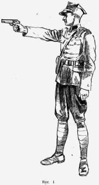 Ponieważ wszystkie czynniki strzału są ściśle ze sobą związane, przeto strzelec uczy się od samego początku całkowitego złożenia się, wycelowania i ściągania spustu. Natomiast dobywanie broni, ładowanie, rozładowywanie, zabezpieczanie i odbezpieczanie należy ująć w oddzielne lekcje. Ćwiczenia wstępne przerabiać w postawach: stojącej, klęczącej, leżącej oraz dostosowanych do terenu tak z wolnej ręki jak z podparciem. Nadto (jako ćwiczenie doskonalące) szkolić w strzelaniu z pistoletu z lewej ręki. Strzelec stojący twarzą do celu robi pól obrotu w lewo i jednocześnie odstawia lewą nogę w bok w przedłużeniu linii bioder i ramion. Wielkość rozkroku zależy od budowy tułowia strzelca. Ciężar ciała spoczywa równomiernie na obu stopach, kolana lekko wyprężone, głowa przy lekkim uniesieniu zwrócona w kierunku celu. Prawą ręką strzelec dobywa pistolet i trzymając go za uchwyt opuszcza go wzdłuż prawego uda w dół na całą długość swobodnie opuszczonej ręki. Lewa ręka zwisa swobodnie wzdłuż tułowia (można ją również założyć za plecy lub oprzeć na biodrze). Dla dania strzału strzelec energicznie wyrzuca pistolet w przód na całą długość wyprostowanej ręki (lecz nie wyprężonej), kładzie palec wskazujący drugim członem na spust i celując przez szczerbinę i muszkę (po lufie) ściąga spust (ryc. 1).