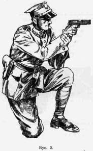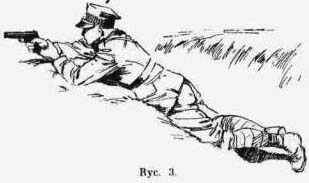 Przy daniu kilku strzałów bezpośrednio po sobie następujących należy, nie odrywając oka od linii celowania, po każdym strzale zwolnić spust i ponownie nacisnąć. 12. Postawa strzelecka klęcząc i leżąc.Postawy strzeleckie klęcząc i leżąc podają ryc 2 i 3. 13. Strzelanie z podparciem.Jako zasadę przyjąć, że przy strzelaniu z pistoletu we wszystkich postawach podpiera się tylko rękę, a nie broń.