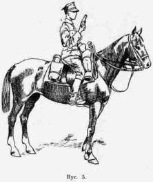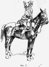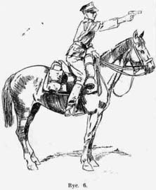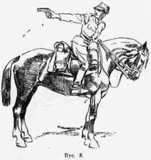 25 Postawa strzelecka na koniu.Jeździec na koniu prawą ręką otwiera futerał, wyjmuje pistolet i trzymając go za uchwyt opiera o udo prawej nogi, odchylając lufę w prawo w dół, odbezpiecza naciskając kciukiem prawej ręki na kurek, po czym zginając rękę w łokciu unosi go wylotem lufy do góry, tak aby pistolet znalazł się na linii prawego oka. Pistolet odchylony lekko w prawo. Łokieć prawej ręki lekko przyłożony do boku. Lewa ręka trzyma wodze. 26. Składanie się w miejscu i w stępie.Przy złożeniu się w przód jeździec pochyla się lekko do przodu bez zmiany dosiadu, wysuwa pistolet w przód, tak aby się znalazł możliwie przed głową konia. Przy składaniu się w prawo, w lewo lub w dół jeździec pochyla się lekko w przód bez zmiany dosiadu i jednocześnie wysuwa pistolet w tym samym kierunku. Składając się w tył jeździec siada głęboko w siodle i zwiaca tułów przez prawe ramię w tył, bez zmiany układu nóg. Podczas wykonywania tych ćwiczeń nie należy pistoletu ładować. Palec wskazujący jeźdźca znajduje się na spuście. Lewa ręka z wodzami lekko oparta o grzywę konia. 27. Składanie się w kłusie, galopie i w cwale.Składając się w kłusie, galopie, cwale jeździec opierając się lewą ręką o grzywę unosi się lekko w strzemionach. Resztę czynności wykonuje jak w miejscu i w stępie. 28. Nabijanie i zabezpieczanie pistoletu na koniu.Do nabicia pistoletu (wprowadzenia naboju do lufy) jeździec trzyma pistolet prawą ręką za uchwyt, a lewą ręką trzymając wodze odciąga suwadło w tył do oporu, po czym puszcza je. Po nabiciu naciska kciukiem prawej ręki bezpiecznik i opuszcza kurek. Pistolet w czasie tych czynności jest skierowany lufą do góry i w prawo w bok. 29. Strzelanie z konia.Podczas strzelania z konia w stępie i kłusie należy celować za pomocą przyrządów celowniczych. W galopie i cwale celować "po lufie". Strzał należy dać przed wyminięciem celu, gdyż strzał w bok lub w tył jest mniej celny, a ze względów bojowych spóźniony. Strzelając w galopie lub cwale do figur polowych ustawionych frontem do osi ruchu celować w bliższy skraj celu, gdyż przy celowaniu w środek celu lub krawędź zewnętrzną pocisk przejdzie poza cel. Do figur polowych ustawionych frontem do jeźdźca celować w środek tarczy. 30 Zmiana magazynka.Dla zmiany magazynka strzelec naciska kciukiem prawej ręki na czepik magazynka. Lewą ręką trzymając wodze chwyta wypadający magazynek, po czym przekłada pistolet do lewej ręki; prawą ręką wyjmuje pełny magazynek z futerału i wkłada go do uchwytu aż do oporu, następnie przekłada pistolet do prawej ręki i zabezpiecza go. Pusty magazynek chowa do futerału. 31 Środki bezpieczeństwa.Podczas strzelania nabojem ostrym z konia obowiązują zasady § 124 i 125 Instrukcji strzeleckiej cz. I. ZAŁĄCZNIKI |